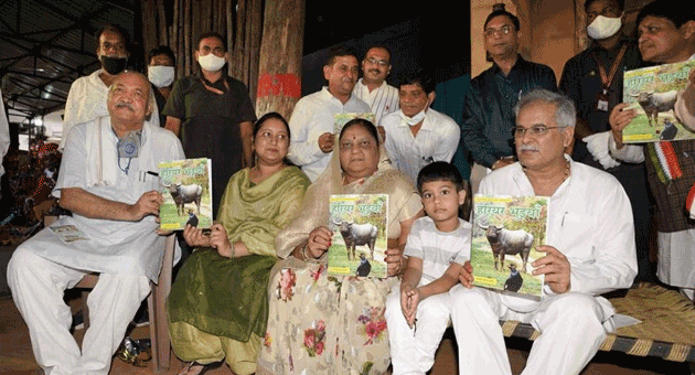 रायपुर(आईएसएनएस)। मुख्यमंत्री भूपेश बघेल ने आज अपने निवास में हरेली तिहार के अवसर पर वन विभाग द्वारा प्रकाशित पुस्तिका ’हरियर भुईयाँ’ गढ़बो नवा छत्तीसगढ़ का विमोचन किया। इस अवसर पर कृषि मंत्री रविन्द्र चौबे, नगरीय प्रशासन मंत्री डॉ. शिव कुमार डहरिया, मुख्यमंत्री की धर्मपत्नी मुक्तेश्वरी बघेल, पुत्री स्मिता बघेल, दामाद दिवाकर वर्मा, नाती अथर्व वर्मा एवं परिवार के अन्य सदस्य उपस्थित रहे।