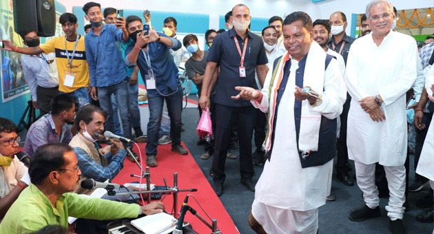 रायपुर। राष्ट्रीय आदिवासी नृत्य महोत्सव एवं राज्योत्सव में विभिन्न स्टालों के निरीक्षण के दौरान जब मुख्यमंत्री भूपेश बघेल और आबकारी मंत्री कवासी लखमा समाज कल्याण विभाग के स्टाल में पहुंचे तब वहां नशा मुक्ति के लिए लोकगीतों के माध्यम से संदेश दिया जा रहा था। आबकारी मंत्री श्री लखमा लोकगीत की धुन पर अपने आप को रोक नहीं पाए और गीत के लय और धुन थिरकने लगे। मुख्यमंत्री श्री बघेल ने भी कलापथक दल द्वारा नशामुक्ति के गीतों की प्रशंसा करते हुए उनका उत्साहवर्धन किया।